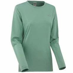Der Einstieg in das blassgrüne Shirt erfolgt über einen Rundhalsausschnitt. Dabei sorgt die Materialkomposition für hohe Elastizität und aktiviert eine schnelltrockenende Funktion. Aus dieser resultieren eine zügige Feuchtigkeitsableitung und ein erfrischendes Hautgefühl. Die Nähte des Langarmshirts wurden besonders flach gestaltet, um unangenehme Reibung zu mindern. Um in der Nacht oder bei schlechten Wetterverhältnissen von einer ebenso guten Sichtbarkeit wie am Tage profitieren zu können, sind die Details im Bereich der Brust wie im Nacken reflektierend.